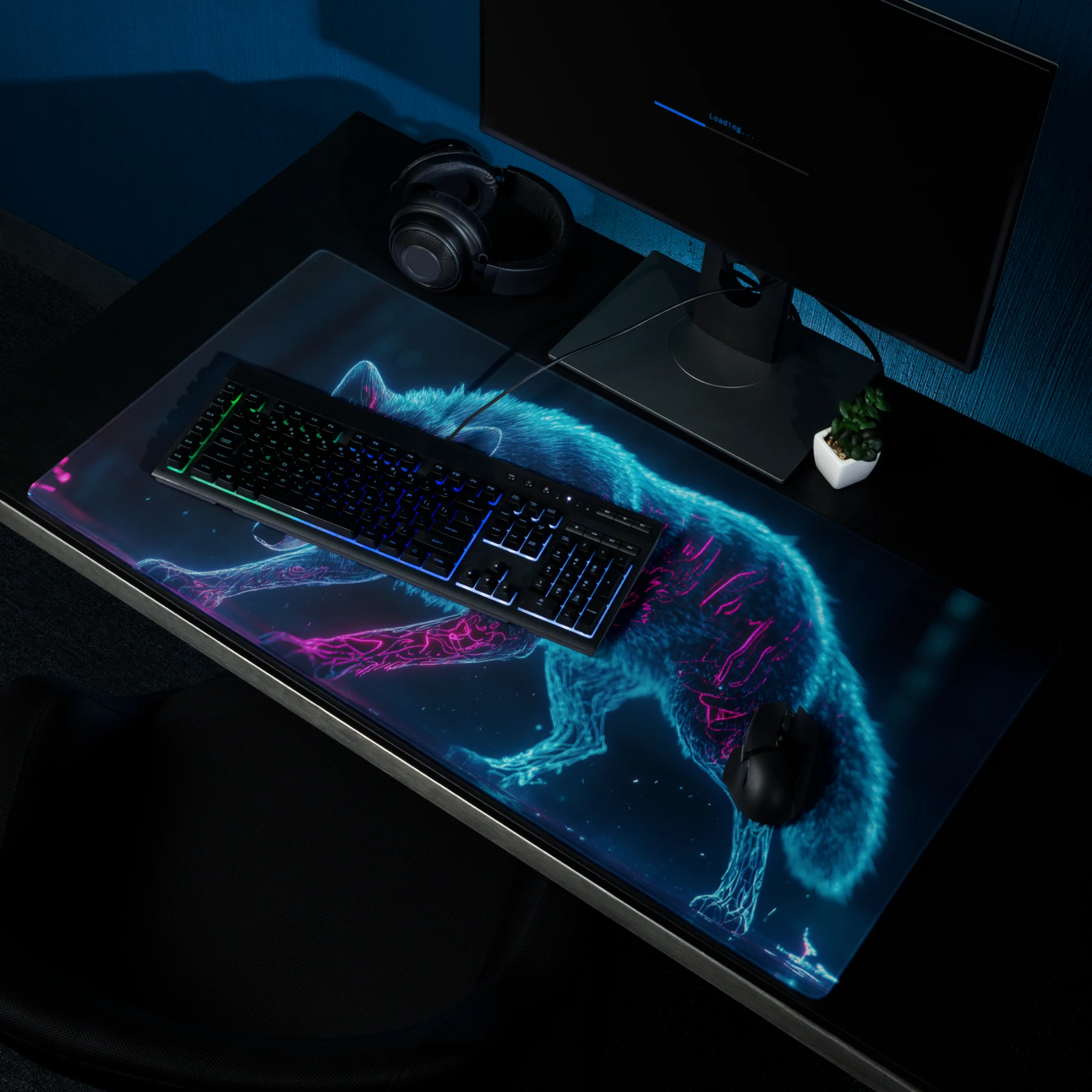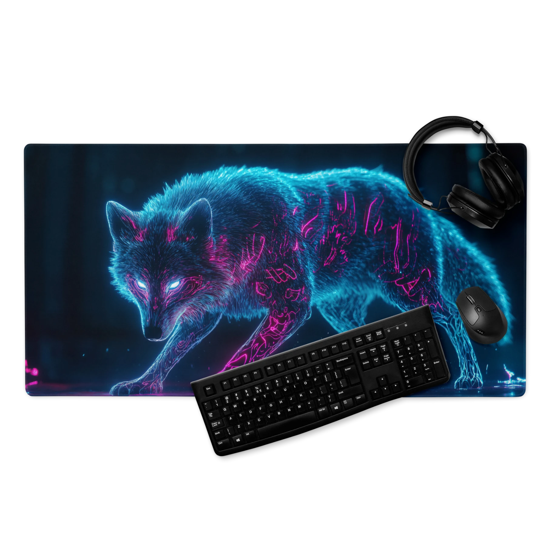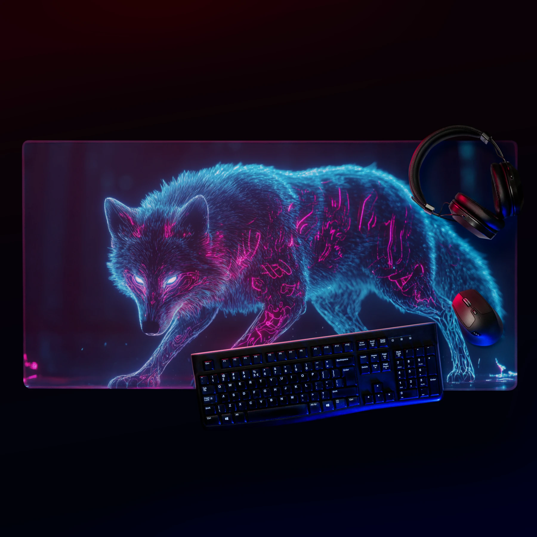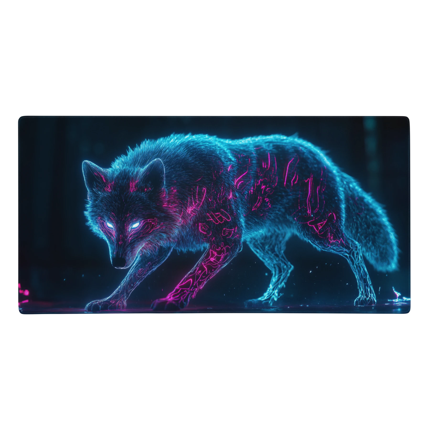 שועל הסייבר פאנק – Cyberpunk Fox: פד גדול לעכבר ומקלדת עם עיצוב ניאון זוהר ועתידני.
