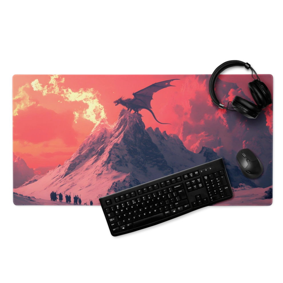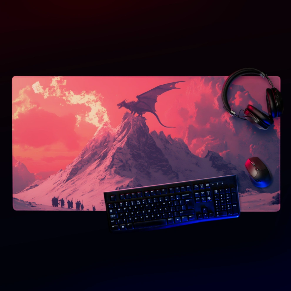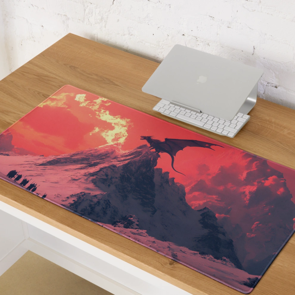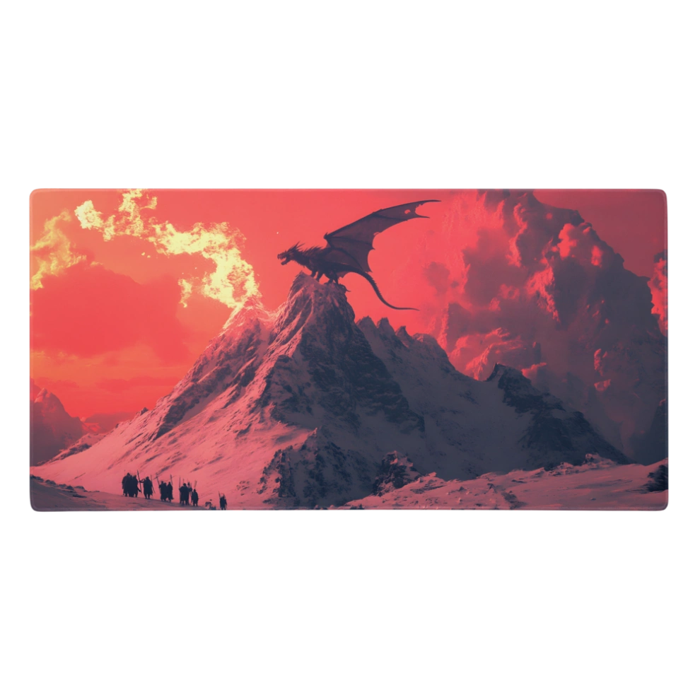 פד לעכבר גיימינג גדול במיוחד עם עיצוב פנטסטי עוצר נשימה: דרקון בוער על פסגת הר מושלגת, שולט בשמיים בגווני אדום לוהט וקור מקפיא. משטח לעכבר ולמחשב שמעורר את הדמיון בכל תזוזה.