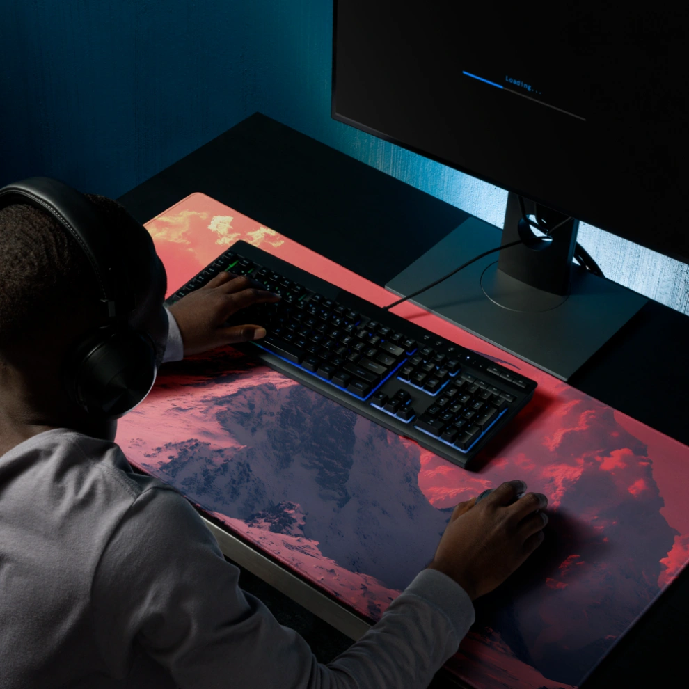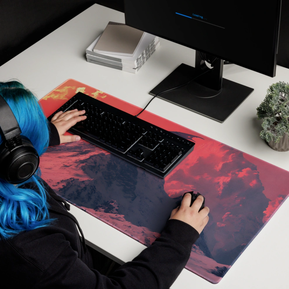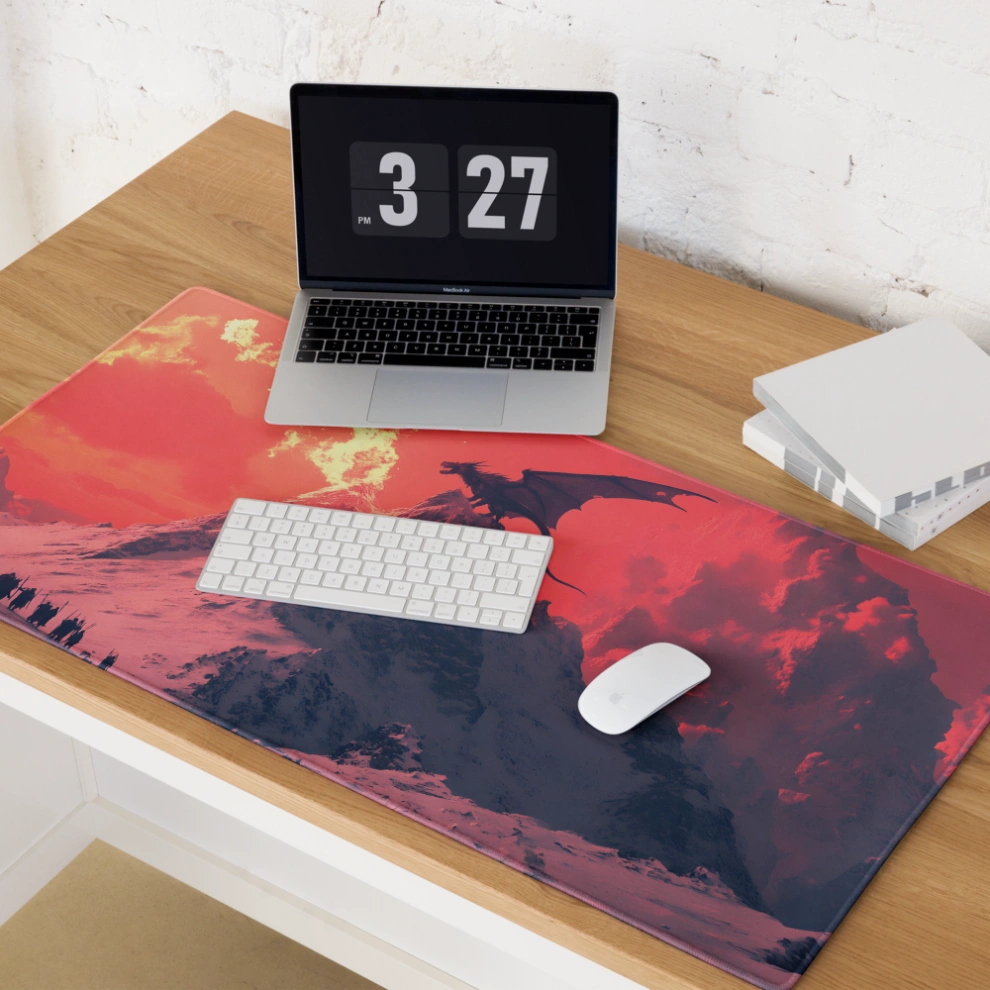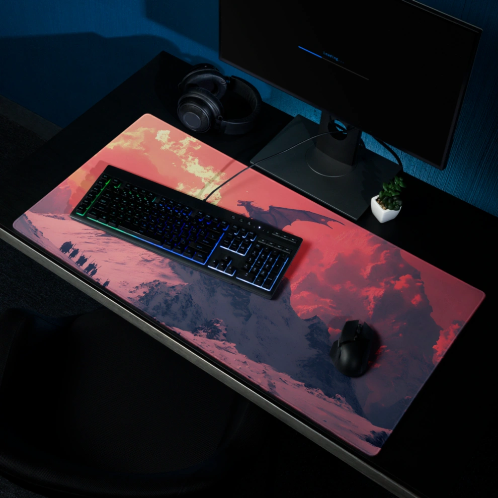 פד לעכבר גיימינג גדול במיוחד עם עיצוב פנטסטי עוצר נשימה: דרקון בוער על פסגת הר מושלגת, שולט בשמיים בגווני אדום לוהט וקור מקפיא. משטח לעכבר ולמחשב שמעורר את הדמיון בכל תזוזה.