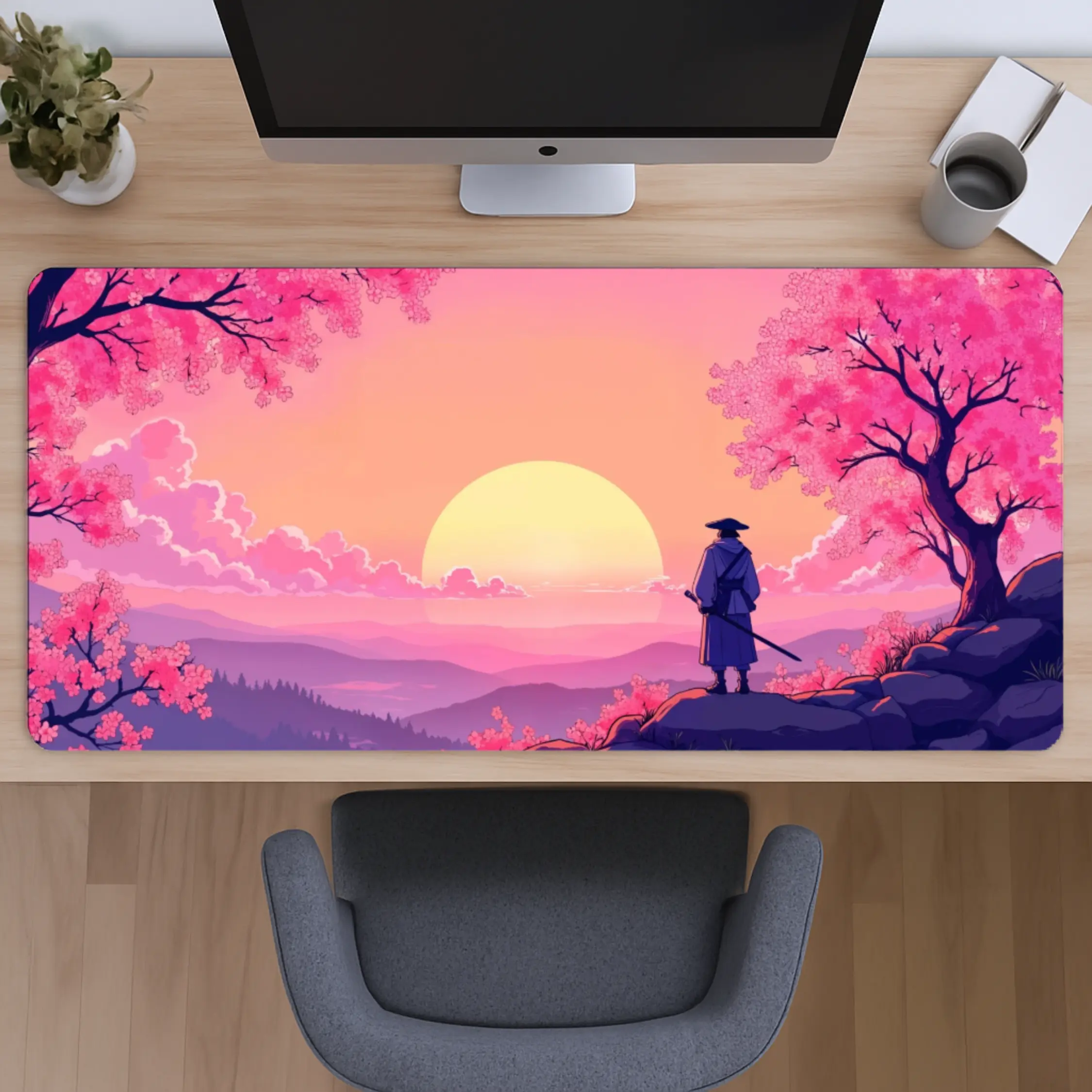 משטח גיימינג מטריף המציג סמוראי עומד בדממה ומשקיף לעבר שקיעה מעל שדות ורודים ונופים הרריים של יפן. עצי הסאקורה הפורחים משלימים את התחושה השלמה של שלווה, בדידות ועוצמה פנימית, אחריות מלאה.