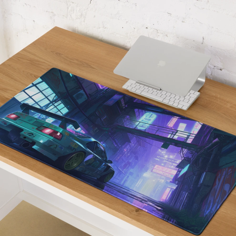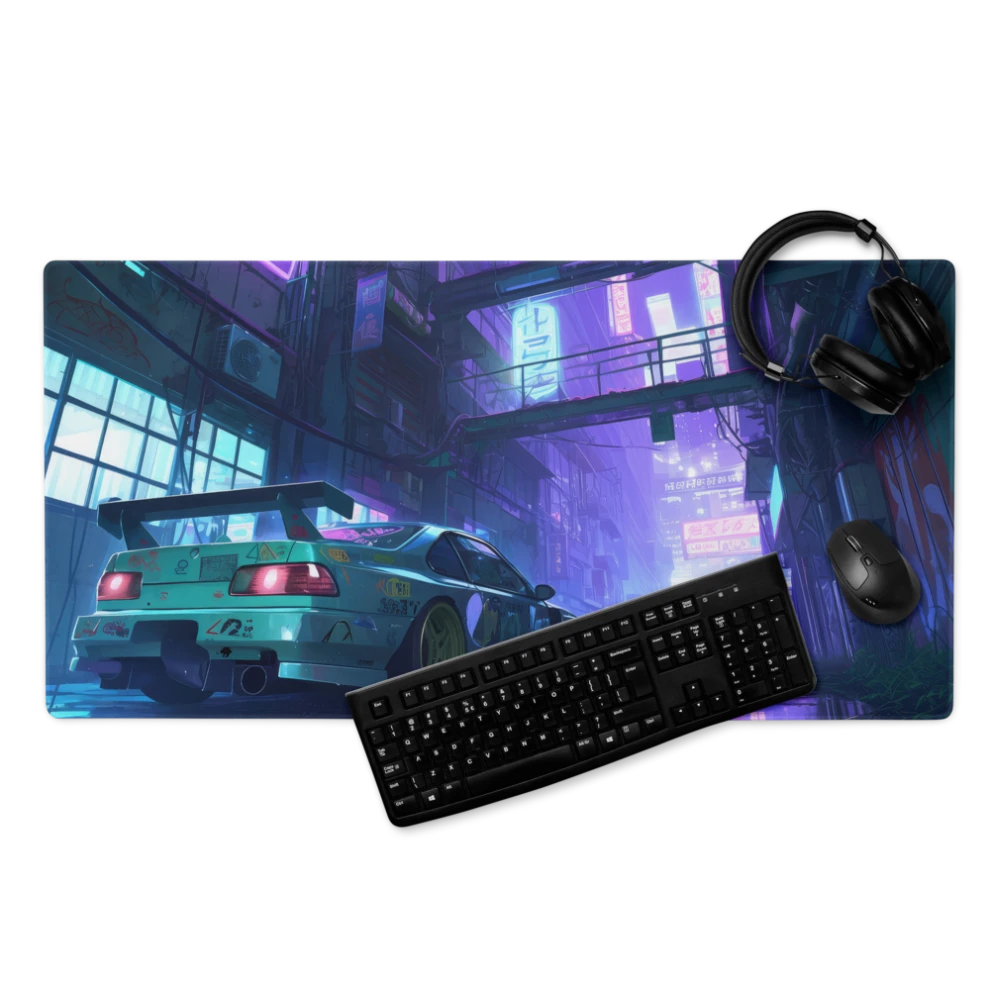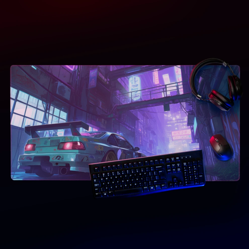 פד מחשב/גיימינג רחב לעכבר ומקלדת בעיצוב מכונית ספורטיבית בסמטת ניאון יפנית, בסיס מונע החלקה וקצוות תפורים. עיצוב מכונית דריפט בלב עולם סייבר־פאנק אנימה.
