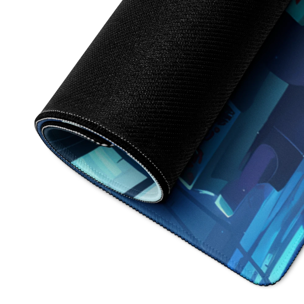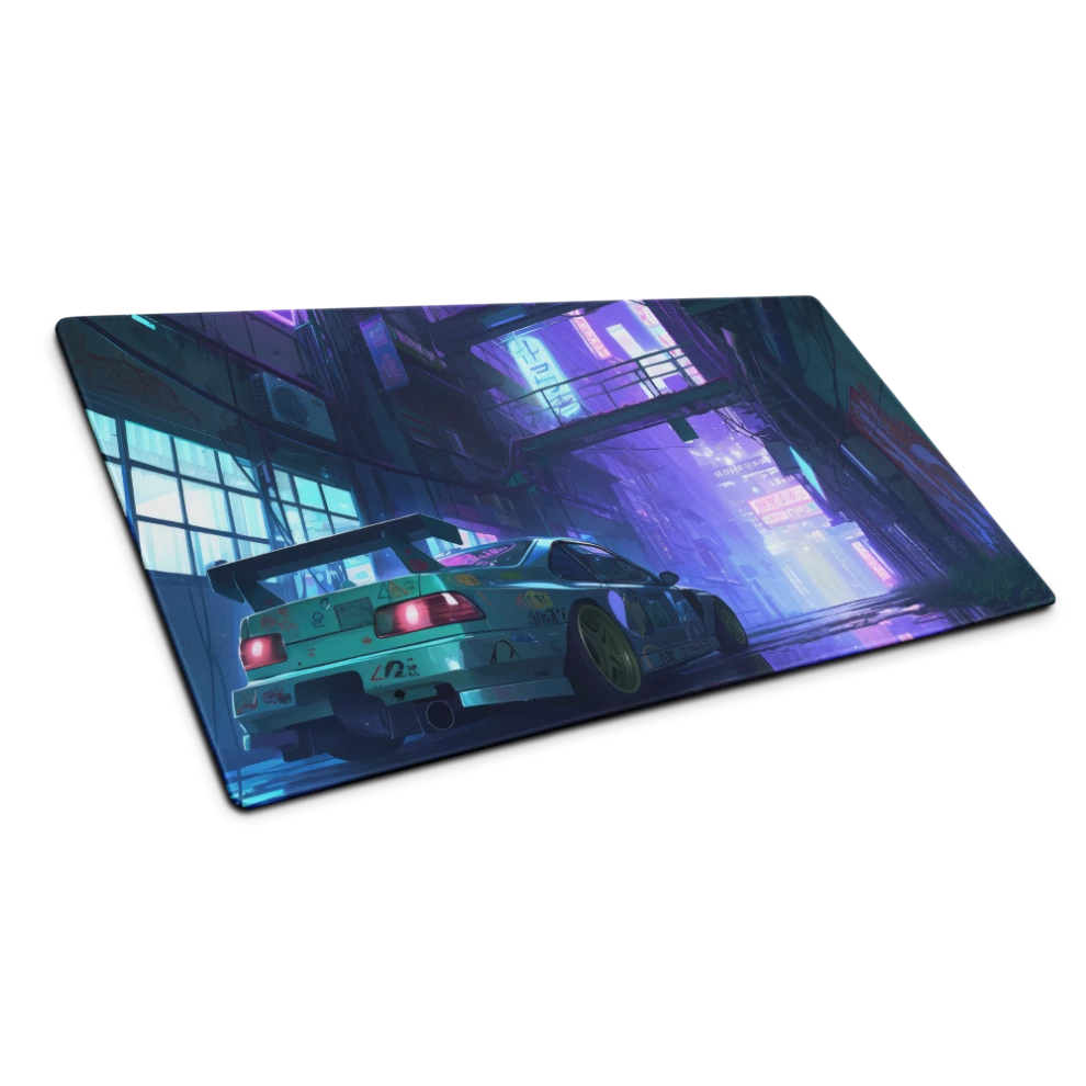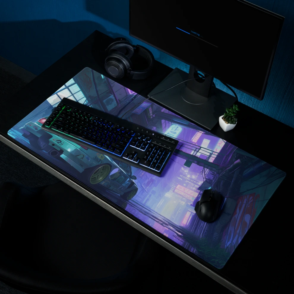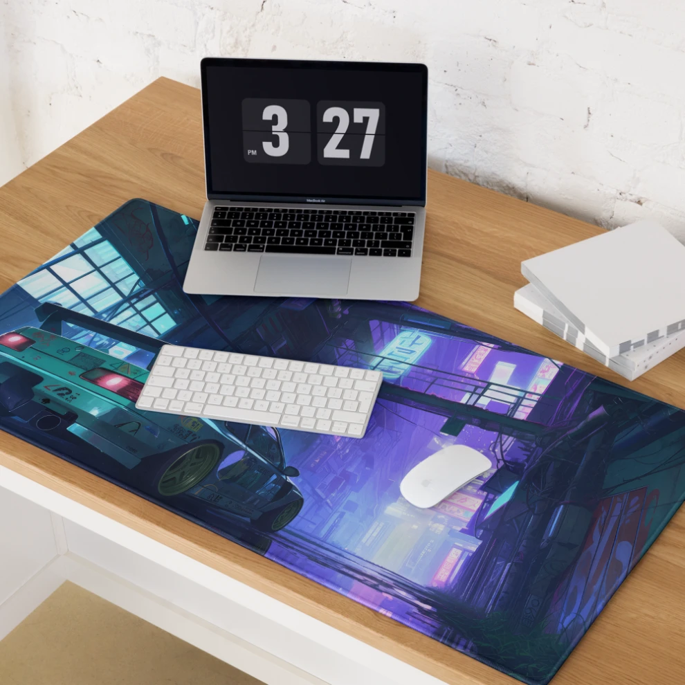 פד מחשב/גיימינג רחב לעכבר ומקלדת בעיצוב מכונית ספורטיבית בסמטת ניאון יפנית, בסיס מונע החלקה וקצוות תפורים. עיצוב מכונית דריפט בלב עולם סייבר־פאנק אנימה.